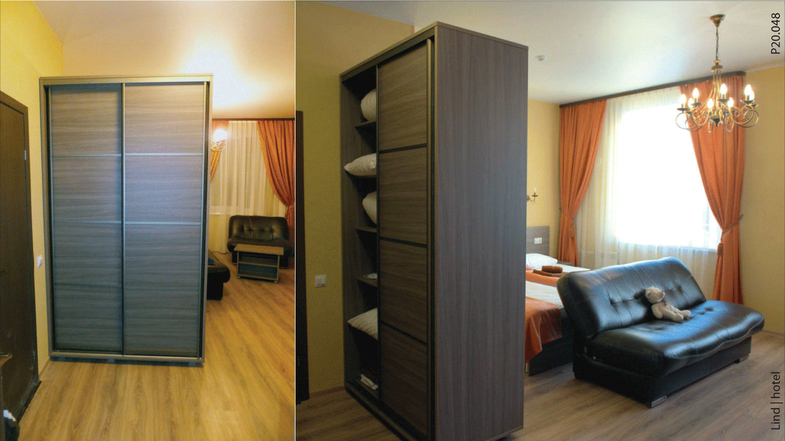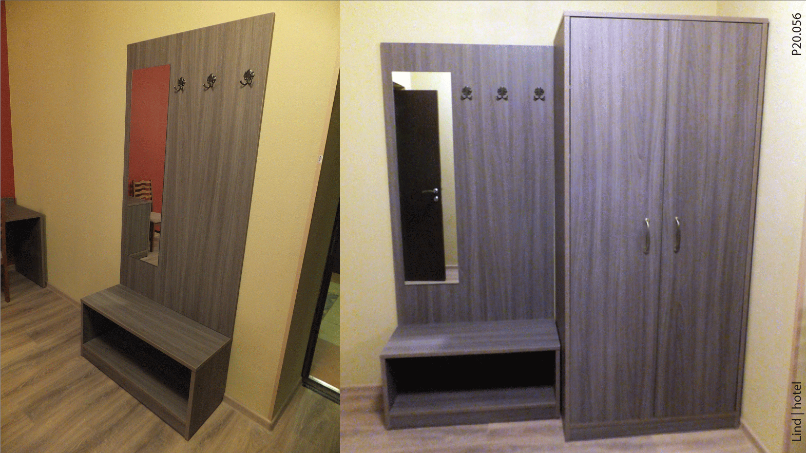 Отличительной особенностью шкафов, так же как и всей мебели Lind | hotel, является повышенная прочность. В шкафах она достигается путем использования для задней стенки ДСП толщиной 16 мм, а для остальных деталей корпуса –22 мм.